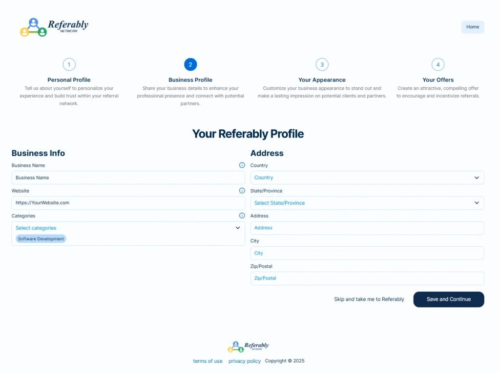 Your Business Profile will be visible on your Public Network Page. Enhance your professional profile with branded images and be sure to include all of your business categories. This will make it easier for other businesses to find and connect with you through the Referably network.