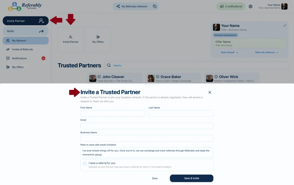 Now it is time to grow your Referably Network and invite 3 to 5 key partners who can help amplify your reach. Think about those who share a similar client base and can benefit from collaborating with you.