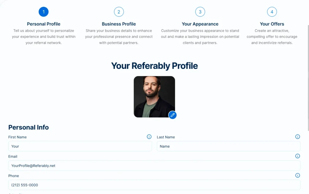 Your personal Referably profile will only be visible to your “Trusted Partners”, those who have either been sent or received a “Let’s Team Up” request and have accepted the request. Include a professional photo, your professional contact information (email, phone, website), and a brief bio highlighting your expertise and what you are looking for in a referral partner. This information helps your Trusted Partners understand your business better and facilitates relevant referral opportunities.